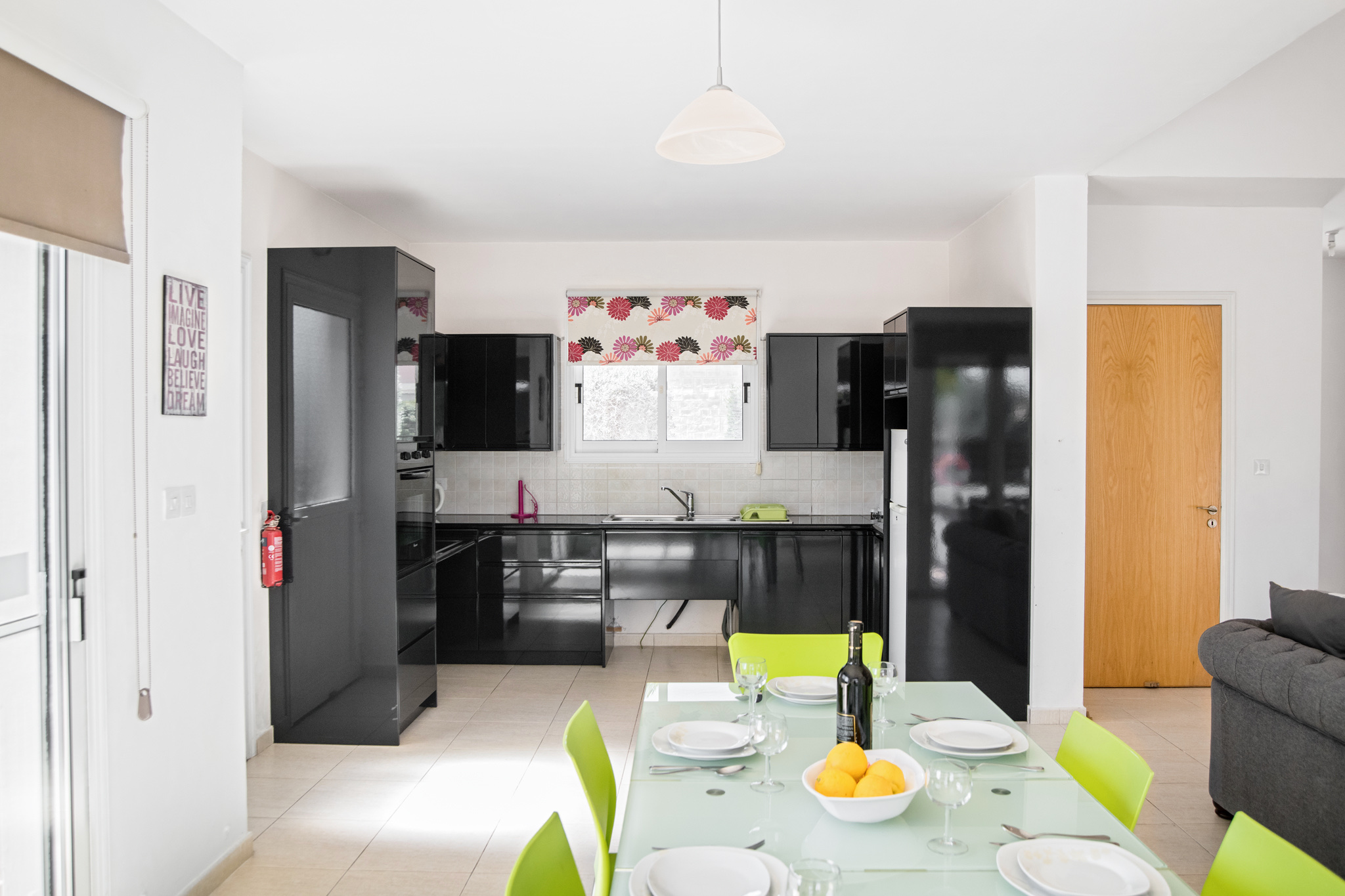 It has an open plan living/dining/kitchen area with feature fireplace. The lounge area comprises two red leather sofas (one of which pulls out to be a double sofa bed). In the dining area there is a large glass table with modern comfortable plastic seating. All of these things contribute to the contemporary design. There is Wi-Fi, a TV with satellite, DVD player, docking station for ipods/phones and a separate CD player to ensure your home comforts are met.