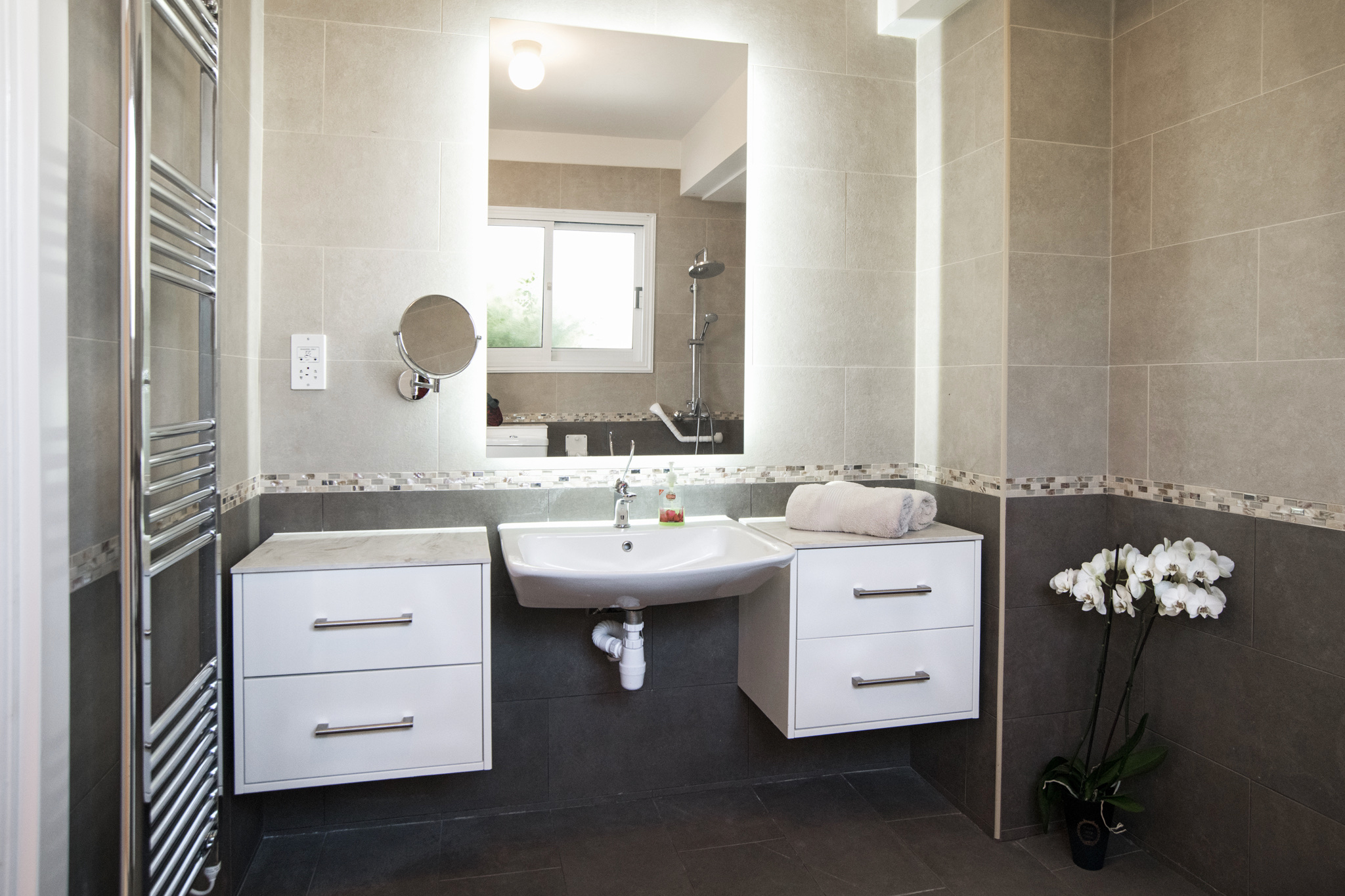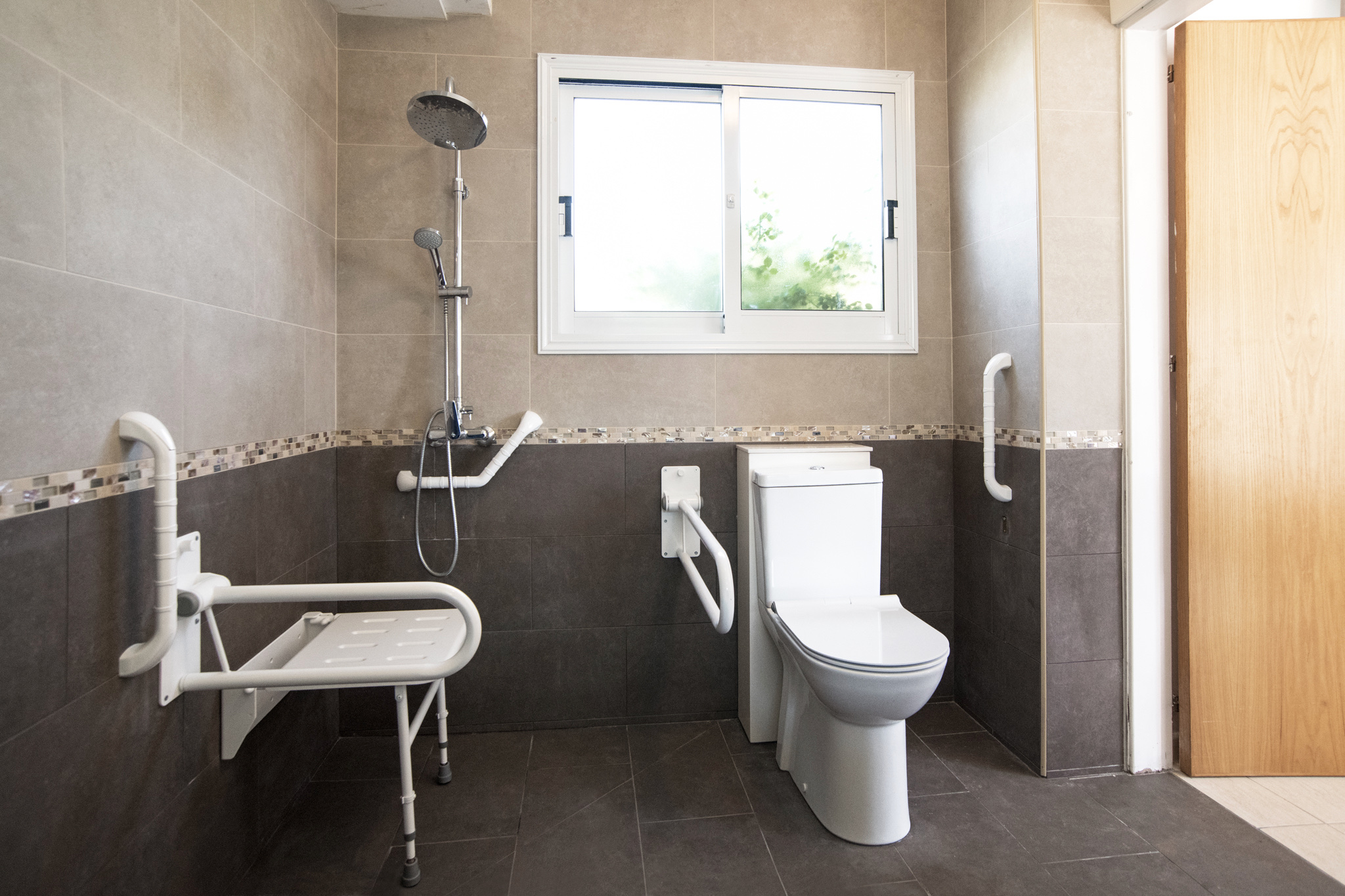 There are three good-sized bedrooms, two doubles and a twin. All with high quality beds, orthopaedic mattresses, fitted wardrobes and each are dressed stylishly. The master bedroom has a large en-suite wheel-in shower room with wall mounted shower seat, wheel under sink area and grab rails. A self-propelling shower chair is also available on request. The further two bedrooms share a second wet room with shower, sink and toilet.